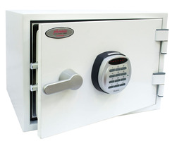 Phoenix Titan FS1281E Size 1 Fire & Security Safe with Electronic Lock\n- The Phoenix Titan III is a modern, compact, fire and security resistant safe designed to meet the need for residential and business use.\n- Fire Protection for Paper: Tested to the International NT Fire 017 - 60 fire test standard, at the Swedish SP Testing Centre providing 60 minutes fire protection for paper documents.\n- Fire Protection for Digital Media: Tested to MTC – DIP120 – 60DMA fire test standard, providing 60 minutes fire protection for digital media, DVD’s, USB memory sticks.\n- Fitted with an advanced high security electronic lock with clear LED display with dual control, hidden code, scrambled code that can be programmed as standard.\n- Recommended for an overnight cash risk of £2,000.00 or £20,000.00 valuables and is also ready prepared for floor fixing with fixing bolts for concrete floors supplied\n- Drop tested from 9.1 meters for resistance to the impact of falling through the burning floors of a building or the collapse of the building.\n- Fitted with 4 internal key hooks, a height adjustable shelf and pull out drawer.