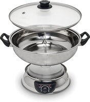 Deze elektrische RVS-hotpot is met een inhoud van 4,5 liter geschikt voor gebruik door 2-6 personen. Je kunt de temperatuur van de fonduepan zelf instellen met een draaiknop. Doordat de hotpot twee aparte vakken heeft, hoef je niet te kiezen voor één bouillon maar wissel je lekker af tussen twee smaken. Perfect voor gezelschappen waarbij er verschil is in dieetwensen (pittig, vegetarisch, vis, etc.).