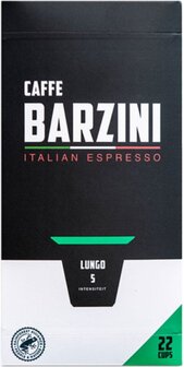 Barzini - Lungo cups: is een blend van heerlijke 100% Arabica koffiebonen met zeer verfijnde smaken die hinten naar cacao en zachte fruitsmaken. De koffie heeft een milde afdronk en is daarom geschikt om de hele dag te drinken.