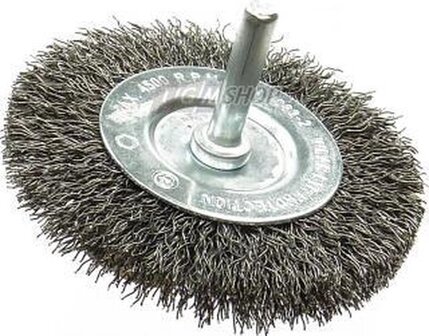 Wheel brush, HSS steel wire, crimped, for derusting, cleaning, paint, scale, encrustation and ridges, for metal and stone, ideal for work on narrow edges, frames, posts, grilles and pipes.