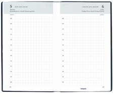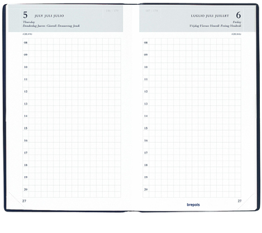 1 dag per pagina, 6-talig, geruit. Boekgebonden. Wit papier van 60 g/m², 384 pagina's. Kunstlederen kaft met zijdeglans, scheurhoekjes. Met technisch compendium. Ft 100 x 165 mm. PVC Seta, zwart