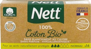 Nett 100% Biologisch Katoen 16 Tampons Normaal zijn tampons zonder inbrenghuls om je perfect beschermd te voelen. De gebogen groeven passen zich zachtjes aan het lichaam aan en vangen de stroom geleidelijk op. Dermatologisch getest. Geurvrij. Geen chloorbleekmiddel. Gecertificeerd Standard 100 door OEKO-TEX®. 100% van het katoen is biologisch geteeld en milieuvriendelijk en sociaal verantwoord geproduceerd. Gecertificeerde biologische landbouw. Gemaakt in Frankrijk.